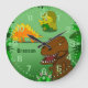 This fun dinosaur lover design custom wall clock has a cartoon brown, scary Tyrannosaurus Rex, a Stegosaurus, and Triceratops dinosaurs. They are surrounded by jungle green leaves.