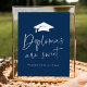 Modern graduation party sign featuring an illustration of a silver foil graduation cap at the top with "Diplomas are sweet" in a handwritten silver foil script on a navy background. Personalize the navy and silver foil graduation sign with your custom text (currently shown with "please take a treat"). The foil graduation party sign is perfect for displaying on a table with dessert or candy graduation party favors for your guests.