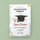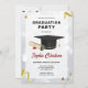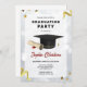 Une invitation simple et belle avec bonnet de diplôme, diplôme et confettis d'or sur un arrière - plan pétillant