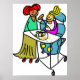 Cute cartoon whimsical illustration of a happy little girl sat eating her lunch in a special support chair with the aid of a carer. Easily customize and choose your own background colour or add text. Image available on various gifts and products.