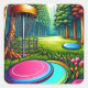 Retro looking disc golf Couse with and Eagle soaring above pine trees ai art.