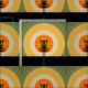 This graphic design features colorful rings around a silhouette disc golf basket and grass.
