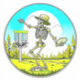 A skeleton playing disc golf in the woods. Retro pop art cartoon style.
