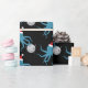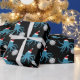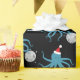 Fun novelty Christmas Wrapping Paper with a pattern of smiling, blue, octopus illustrations wearing Santa hats and holding disco balls on a black background.