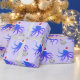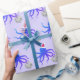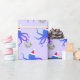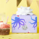 Fun novelty Christmas wrapping paper with a pattern of smiling, purple, octopus illustrations wearing Santa hats and holding disco balls on a light purple background.