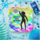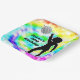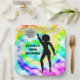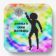A cool plate with a tie dye background and a disco woman silhouette with custom wording. Great for any age birthday party.