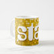 Mug with a fun and funky stylised "disco mirror tile look" printed pattern in shades of yellow gold and white, and retro style text. Can be used as a background for your own text, images and ideas. Please note this is a printed digital art image, it does not shine or contain real mirrors or glitter.
