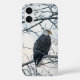 A photograph of a Bald Eagle sitting on a tree branch, looking to one side, with having a piece of fish dangling from it's beak. The bird appears to have a furrowed brow, indicating it has disgust for whomever disturbed it. The tree that the eagle is perched in has no leaves as the photographed scene was in winter. Image Copyright ©2021 Kimberly J Tilley.