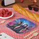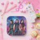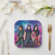 Make your party table unforgettable with this bold Disney Descendants birthday paper plate featuring Mal, Evie, and Uma ready for adventure. The design showcases the three stylish heroines standing confidently in their signature outfits with vibrant blue, purple, and red accents against a dreamy pink and purple background. The iconic Auradon castle rises behind them, setting the scene for a celebration full of magic and attitude. Perfect for serving cake, snacks, or party meals, this plate brings a touch of Descendants flair to any birthday bash.