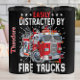 This is a fun, graphic design for anyone obsessed with emergency vehicles. A stylized red fire truck is rendered in a cartoon style with many exciting details and is surrounded by a white burst effect. The text above the truck reads "EASILY DISTRACTED BY", and the bottom text finishes the message with "FIRE TRUCKS". The customizable name "Theodore" is placed vertically on the left, making this a great personalized gift for a fire engine enthusiast.