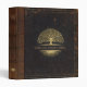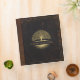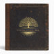 Custom genealogy/family tree binder with distressed vintge black leather covers, brown leather spine detail and gold accented trim and tree icons.
