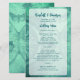 Budget wedding menu template in free with distressed green paper. This layered-look paper has a map, moth and splatter background in teal green. Dark green text is printed over a transparent white panel with places for first names of the couple, date, location, menu title and list of menu items. The paper is very affordable, with discounts for bulk orders.