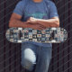 Skate in style with this unique skateboard featuring a distressed denim patchwork design adorned with skulls, florals, and boho vibes. Perfectly blending hippie, retro, and goth aesthetics, this board is a bold statement for those who embrace edgy, unconventional style.