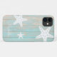 Distressed tropical beach blue faux wood with three white graphic starfish and personalized phone case.