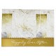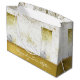 Large elegant wedding gift bag done in a white, grey, and gold tone distressed flourish design. Graphics of a solid gold tone, with a gold glitter looking beaded border, decorates the bottom part of the bag. Personalize the white text, on the bottom part of the bag, to suit your needs. Matching tissue paper available. Lovely for bridal showers or wedding gifts.