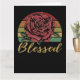 Send this distressed vintage-style greeting card with your own personalized message on the front and back. Features a classic red rose in front of a distressed retro sunset background and the word "Blessed" in gold font.