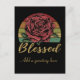 Send this distressed vintage-style postcard with your own personalized message on the front and back. Features a classic red rose in front of a distressed retro sunset background and the word "Blessed" in gold font.