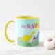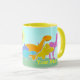 Dites Rwar ! Tasse nommée de dinosaures. Une famille mignonne de dinosaure avec le Diplodocus jaune, l'oeuf de dinosaure rose de bébé, le Stegosaurus bleu, le Diplodocus orange, un Triceratops jaune doux et des dinos pourpres de bande dessinée de T-Rex dans un paysage ensoleillé avec le soleil brillant dans une tasse potable personnelle de ciel bleu avec votre nom. Ajoutez votre nom pour personnaliser vos dinosaures d'unqiue l'attaquent et rendent spécial ! Cette tasse de dinosaure est entièrement personnalisable, ajoute vos images et textes. Très un frais indique "Rawr !" petite tasse heureuse de dinosaure avec votre nom là-dessus !