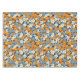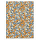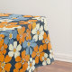A vibrant floral pattern covers the entire image. Small, stylized flowers in shades of orange, light blue, and off-white are densely arranged on a navy blue background. The flowers have a slightly imperfect, painterly appearance, with variations in colour saturation and shape that give the pattern a textured, almost hand-painted look. The repeated pattern creates a cheerful and busy visual effect.