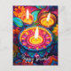 The postcard showcases a vibrant celebration of Diwali, featuring an array of beautifully lit diya lamps that form the focal point. These lamps emit a warm, golden glow, casting a gentle radiance across the scene. The background is a tapestry of vivid, harmonious colours that provide a striking contrast to the luminous lamps.