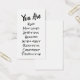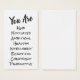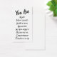 This set of gorgeous cards can be customized to feature the words you prefer. The original design reads "You Are Kind Motivated Ambitious Healthy Intelligent Beautiful Confident Productive" with each affirming word on a new line. Use the template fields to replace any of the affirmations with one or more of your own, replace them all, or buy them as is. You may wish to change "You Are" to "I Am" or "We Are" or "Let's Be" or all manner of other declarations! Suitable for people intending to remind others of their worth, for positive thinkers, for those who practice the Law of Attraction, or for anyone at all who enjoys participating in the "Random Acts of Kindness" movement. The possibilities go on and you can enjoy them in whatever way you prefer. The design is simple and basic with black text over a plain white background that is editable; add whatever colour you prefer or even add a graphic or photo behind the words; make this card your own! Many other similar designs are available so check out the other similar designs in my store, too, if you'd like something less plain than these are.