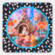 Adorbs little hamster in the candy filled lollipop garden of a gingerbread house, Black sticker with a border of cut paper and colourful triangles.