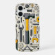 A vibrant assortment of tools and hardware is meticulously arranged, with a hammer, wrenches, and saws colourfully illustrated in an engaging pattern