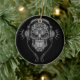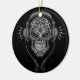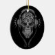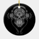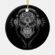 An elaborate DJ sugar skull design decorated with intricate swirls and dot patterns. Headphones sit on top of the skull with two wires hanging below. The complex lines and circles are solid black while the interior of the skull is finished with highlighted shades of grey. Music blasts out of the headphones in the form of grey lightning bolts and the pure black background. This aggressive Day of the Dead inspired image makes a striking ornament