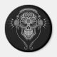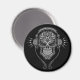 An elaborate DJ sugar skull design decorated with intricate swirls and dot patterns. Headphones sit on top of the skull with two wires hanging below. The complex lines and circles are solid black while the interior of the skull is finished with highlighted shades of grey. Music blasts out of the headphones in the form of grey lightning bolts and the pure black background. This aggressive Day of the Dead inspired image makes a striking magnet