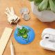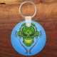 An elaborate DJ sugar skull design decorated with intricate swirls and dot patterns. Headphones sit on top of the skull with two wires hanging below. The complex lines and circles are solid black while the interior of the skull is finished with a deep highlighted green and vibrant yellow. Music blasts out of the headphones in the form of black lightning bolts. A shadow falls onto the bright blue background making it look like the skull is sitting just above the surface of the keychain. This aggressive Day of the Dead inspired image is a colourful representation of DJ culture.