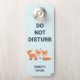A door hanger with a graphic illustration of 2 orange foxes looking cute and happy. Text says Do Not Disturb, with a personalized name.
