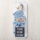 Please do not disturb door hanger with a cute photograph of a little snowman. Standing outside in the winter with snow falling all around. This cute little guy is dressed up in blue knitted hat and scarf.