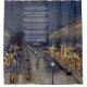 This shower curtain features the poem "Do Not Go Gentle into that Good Night" by Welsh poet Dylan Thomas and the painting "The Boulevard Montmartre at Night" by painter Camille Pissarro. Dylan Thomas wrote the poem in 1947, according to various sources, possibly for his father. Thomas died in 1953. Camille Pissarro painted "The Boulevard Montmartre at Night" in 1897. Both the poem and the painting are in the Public Domain now.
