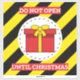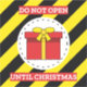 An illustration of a simple red gift box with the text "Do not open until Christmas", and black and yellow striped background. Gifts are the best way of giving surprise to your family and friends. This design is good to be printed on a sticker or gift wrapper for the presents put under the Christmas tree.
