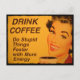 Smiling woman with retro red lipstick and nails drinks her cup of morning coffee. The caption reads "Drink Coffee - Do Stupid Things Faster with More Energy."