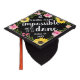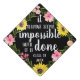 Cute grad cap topper features the quote "it always seems impossible until it's done" in white brush script lettering on a black background adorned with pink watercolor flowers, green foliage and vibrant yellow sunflowers. Personalize with your class year.