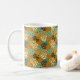 This mug has a mid-century modern design of a record adapter overlapping all over in tan, off-white, brown, orange, turquoise, blue, and green.