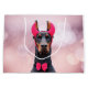 Doberman Pinscher black and brown coloured breed type dog wearing bright pink devil horns on a pink headband and a pink bowtie. Set on a pink bokeh flare background.
