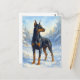 A sleek Doberman Pinscher stands proudly in a snowy forest, its alert posture and striking markings contrasting beautifully against the serene winter landscape.