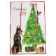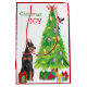 On each side of this Holiday gift bag, a Doberman Pinscher Dog wears a red bandana scarf while he sits beside a Holiday tree. Around the dog brightly wrapped gift packages are scattered about. A bullfinch is landing on the Christmas tree. The red and green text says "Christmas JOY".