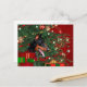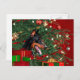 Black and tan Doberman Pinscher sits by the Christmas tree and among the presents just waiting for all the action dog lovers custom Christmas holiday postcard