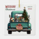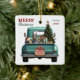 A teal blue retro pickup truck carries a decorated Holiday tree and gift packages on this cute ceramic Christmas ornament. Looking out from the tailgate is a beautiful Doberman Pinscher dog. A rustic wooden sign on the back bumper says "Christmas Cheer". The red and green stylized text at the top left says "MERRY CHRISTMAS", with your name (or your dog's) and the year at the right. Both sides have the same image.
