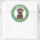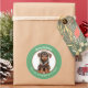 An image of an adorable black and tan Doberman Pinscher puppy dog wearing a winter hat is at the centre of this Holiday sticker. The image is framed in a circular green border which contains your custom text in white. Cute for Christmas cards, correspondence, and gift packages.