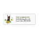 Le côté gauche de ces étiquettes d'adresse de retour présente l'image d'un beau chien Doberman Pinscher parmi des tournesols épars et des feuilles d'eucalyptus. Votre texte personnalisé est en vert et noir à droite.