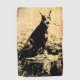 A beautiful sepia tone black Doberman Pinscher sitting on an old lichen covered tree stump in the woods.