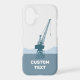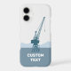 Silhouette of dockyard cargo crane. Vector icon with customizable colour. Custom text.
