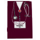 Creative medical gift bag featuring maroon hospital scrubs. To personalize edit text to add doctor or physician assistant's name.