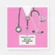 Medical School graduation party napkins featuring pink hospital scrubs, a stethoscope, and Swiss Army knife. To personalize edit text to add doctor's name.