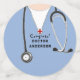 Creative party decoration for doctor event or medical school graduation celebration featuring blue scrubs and stethoscope. To personalize edit text to add name of physician.