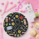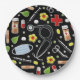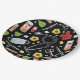 Creative doctor event or medical school graduation party plates featuring healthcare supplies and flowers pattern on black background.